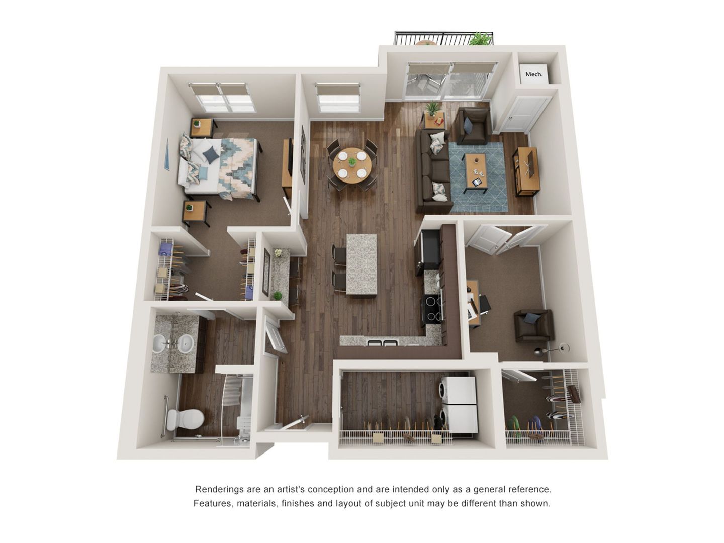 The Orbit is our largest one-bedroom option at 1,007 sqft. This floor plan also includes a den with a walk-in closet. Other features include a full-size washer and dryer, brown cabinets, and a built-in desk off the kitchen.