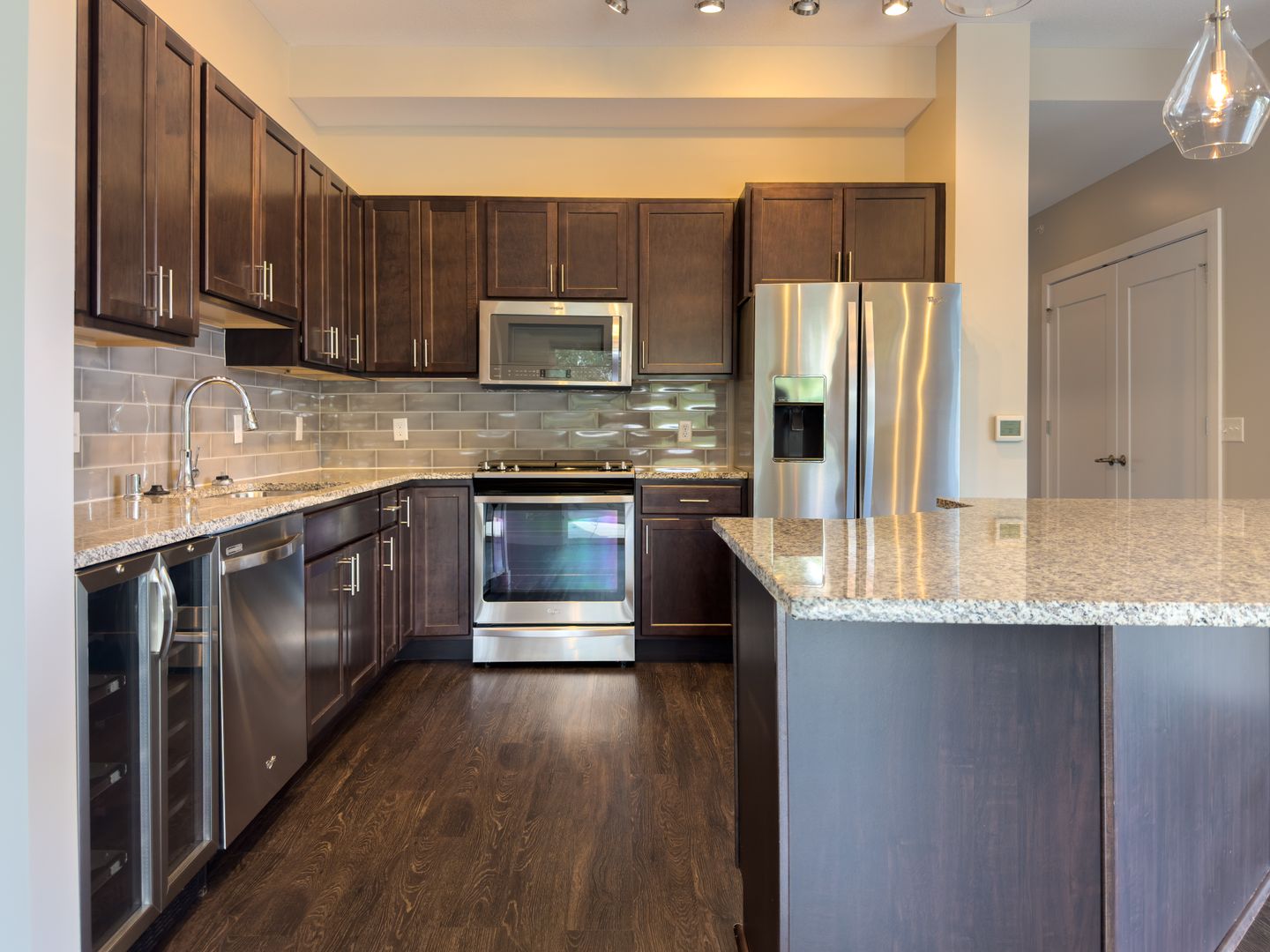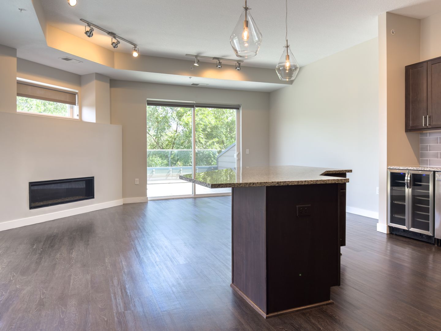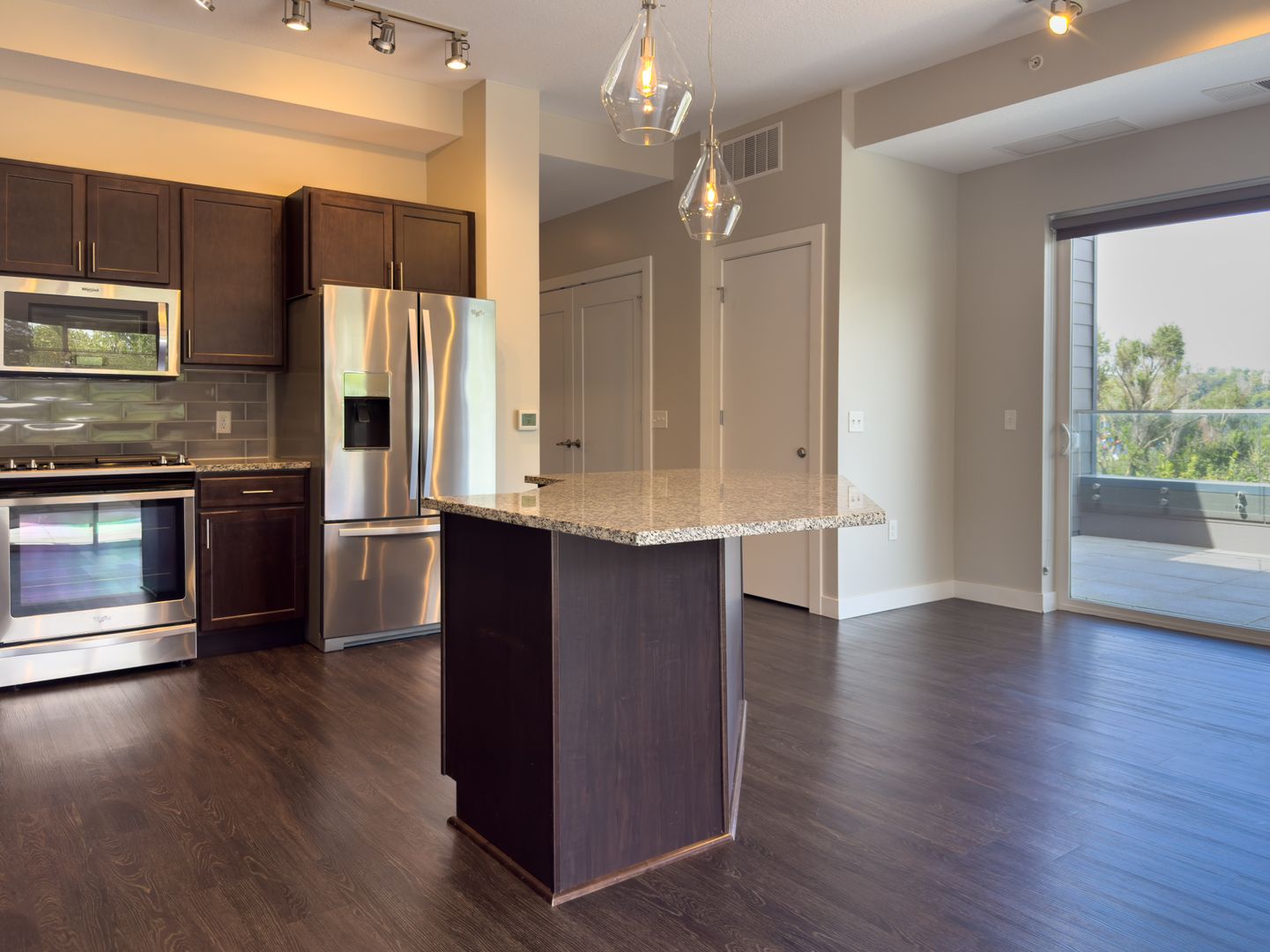 The Summit is our largest penthouse, boasting 1,575 square feet of luxury. This unit features beautiful wood cabinets, granite countertops, stainless steel appliances, a fireplace, a balcony off each bedroom, and a massive corner balcony with spectacular views.
