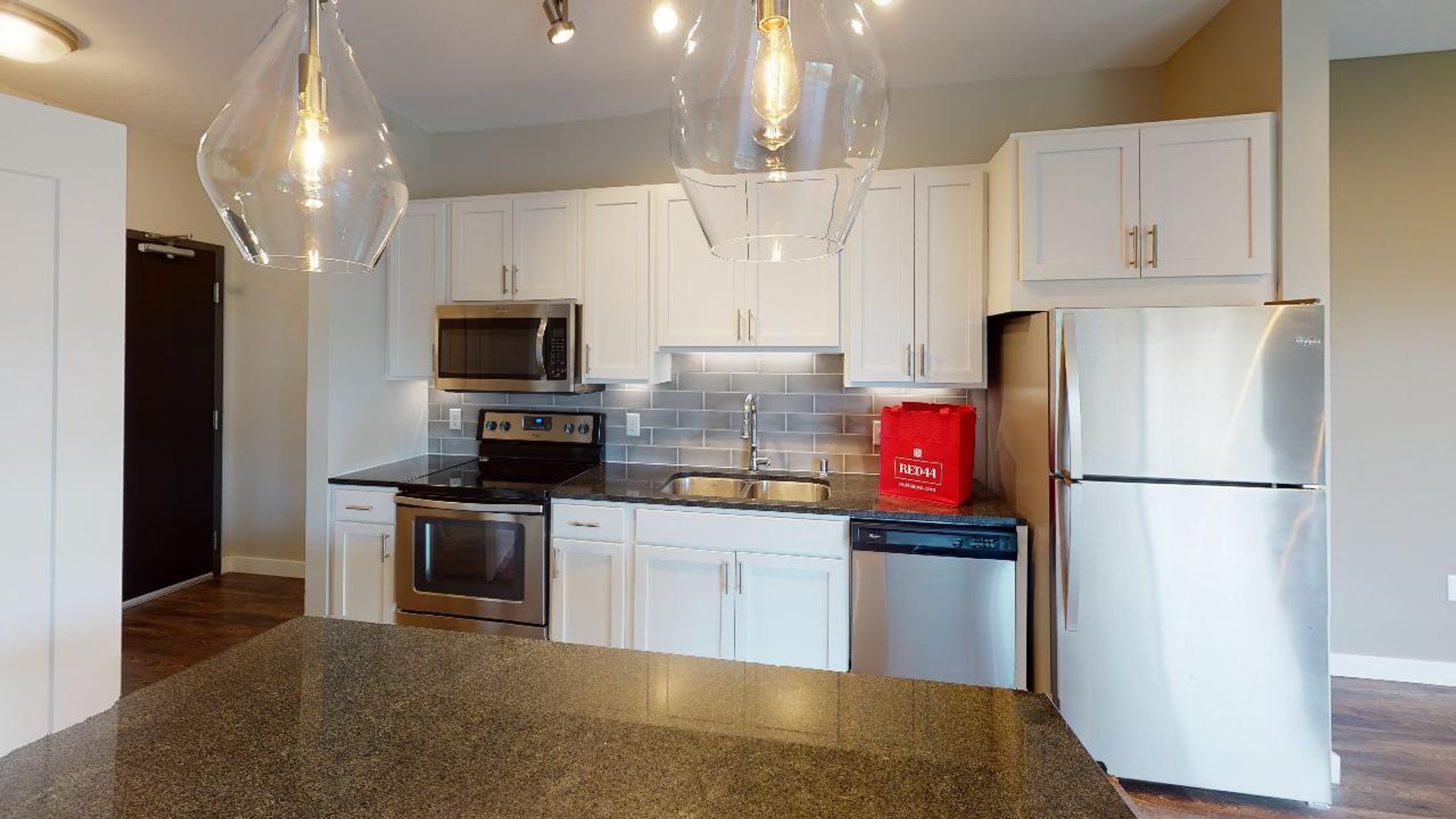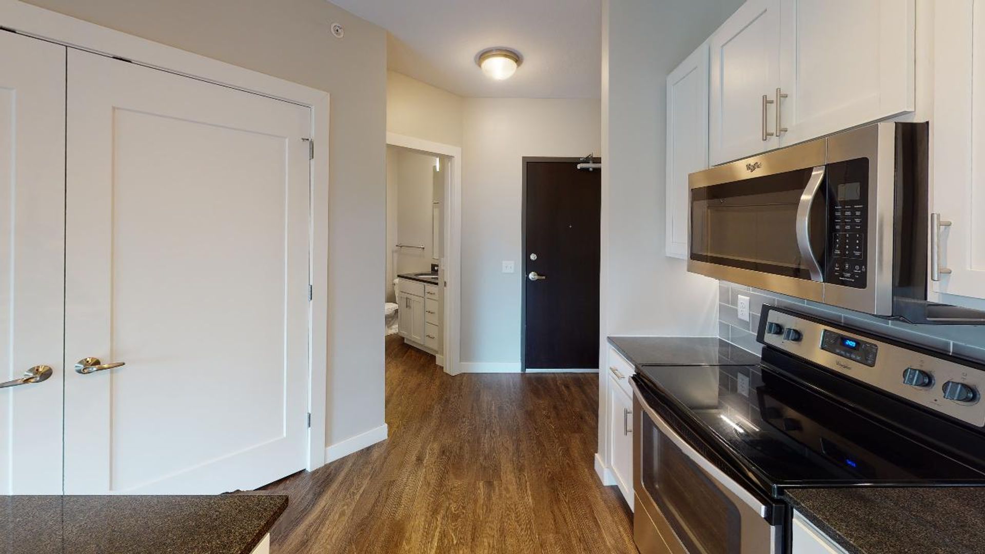 The Meridian is our most unique one-bedroom apartment. Make your home especially yours with this fun layout featuring white cabinets, black granite countertops, and a full-size washer and dryer.